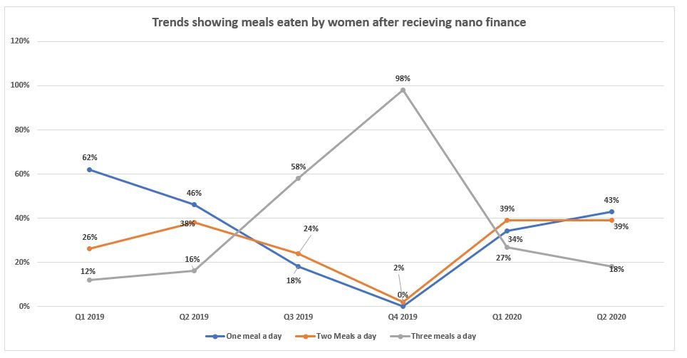The pandemic had obvious and immediate effects on our community members and their families. For example, at the end of Q4 in 2019, 98% (49) of the women provided with nano finance were eating three meals a day, but by Q2 2020, the percentage of households eating three meals a day had dropped to 18% (19) households among the women benefiting from the nano finance. This was brought about by COVID – 19 pandemic and its associated impact on the rural poor who leaves on hand to mouth.